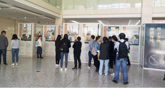 本次展览集中展示《新时代高校教师职业行为十项准则》和高校发生的典型案例师德师风警示案例,用“身边事”教育“身边人”、用“同类事”教育“同类人”,引导全体教职工受警醒、明底线、知敬畏。