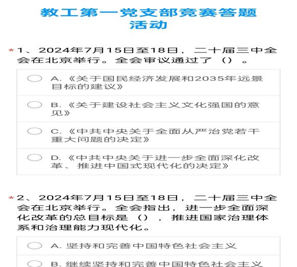 为了更好的覆盖全体党员,此次竞赛活动依托问卷星网络平台进行,竞赛题目分为单选题和多选题,满分为100分,为了激发大家的学习和答题热情设置了奖励活动。竞赛活动发出后,支部同志积极参与,活动结束时支部成员一致认为竞赛活动激发了大家的学习热情,更深刻的理解了二十届三中全会的精神,表示要将二十届三中全会精神进一步贯彻落实到工作生活中。