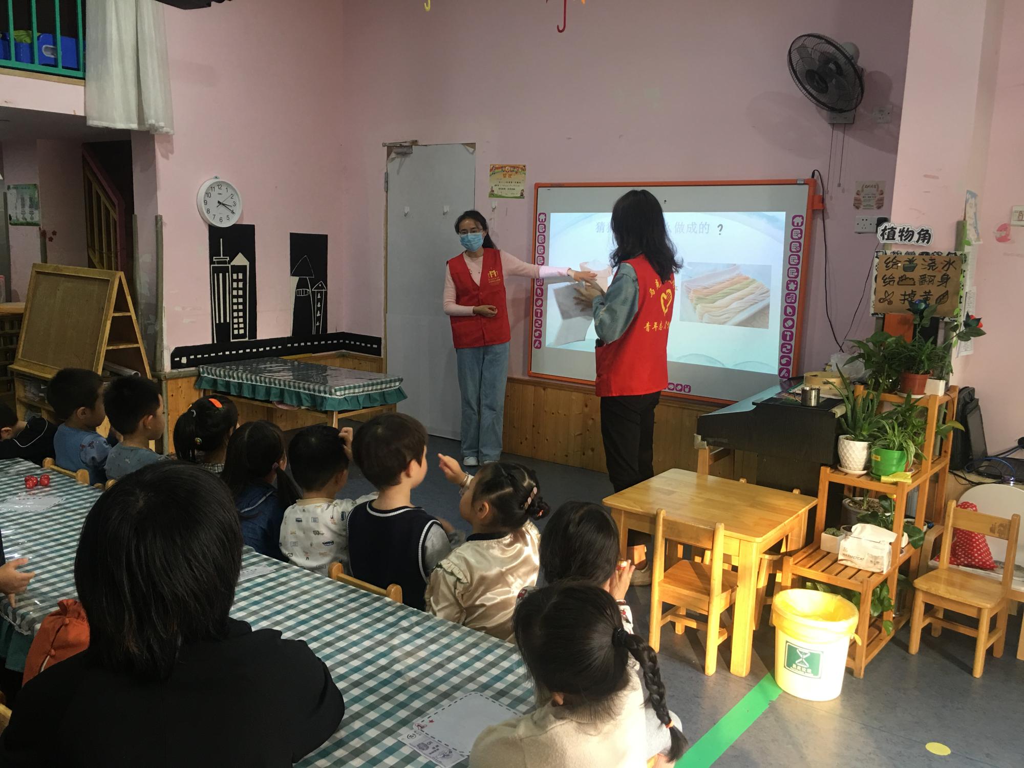 志愿者们2人一组,分别负责幼儿园各个班级,在各班老师的允许下,带领小朋友们做游戏、学习,度过快乐的下午时光。在课堂中,志愿者们让小朋友们了解眼前的粮食是什么,认识并熟悉其名称。然后用动画演示粮食生长过程。在互动环节中,志愿者准备了由不同粮食制成的小面包、炸糕、点心等等让小朋友们试吃,让小朋友们猜测吃的食物是由哪种粮食做成的,再宣布正确答案。在试吃环节中,小朋友们踊跃参加,有些小朋友猜测点心是大米做的,有些猜测是玉米做的。有一个小朋友猜对了,说点心是小麦做的。志愿者就奖励了一根棒棒糖给这位答对的小朋友。最后, 志愿者通过教授儿歌让小朋友们了解农民伯伯种植粮食的辛苦不易及帮助小朋友们初步形成节约粮食的意识萌芽。课程结束后,小朋友们都很开心,学到了很多关于粮食方面的知识。