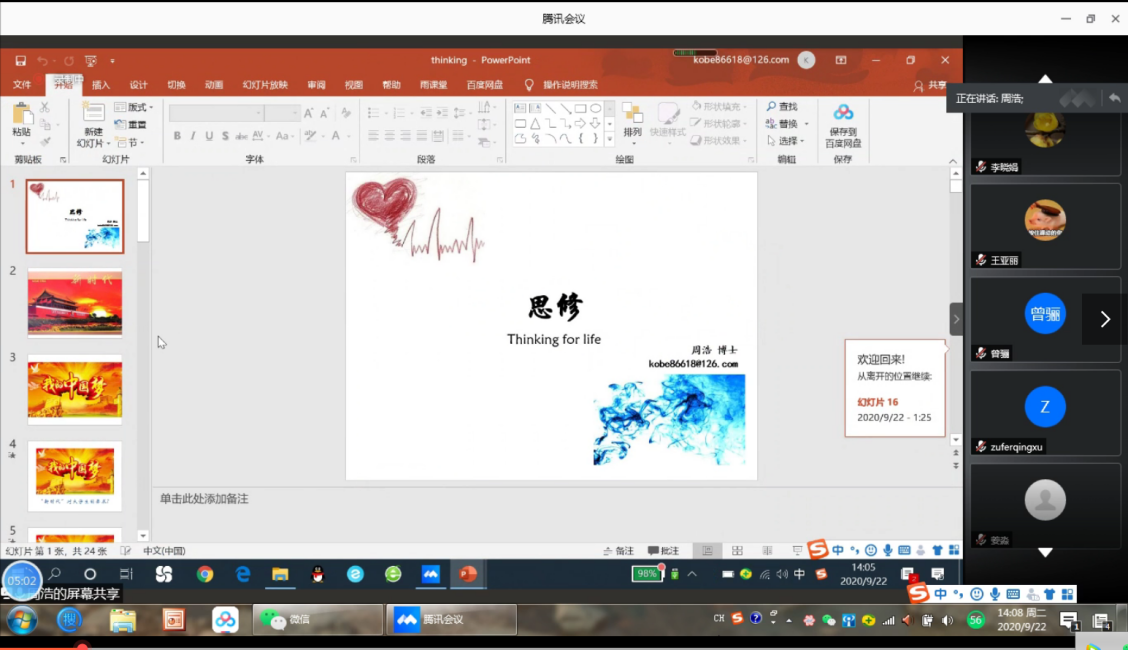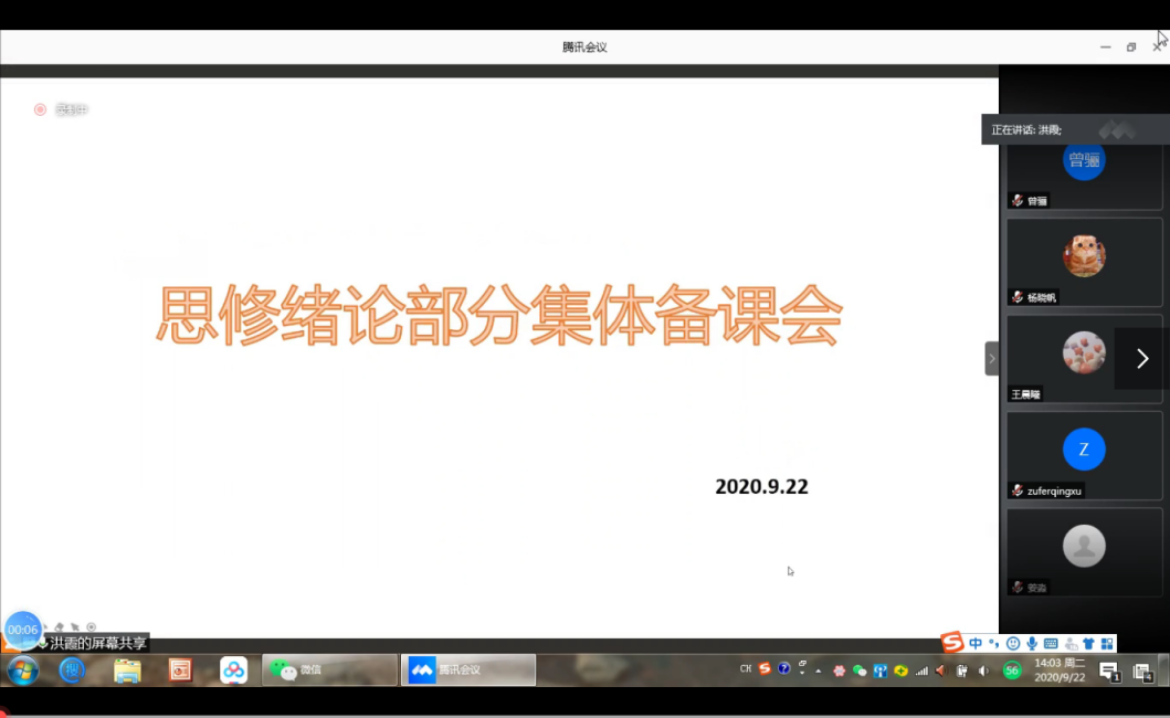 接下来,周浩老师以说课的方式分享了《思想道德修养与法律基础》课绪论部分的讲课思路与心得体会。周浩老师紧紧围绕着“新时代”和“中国梦”两大主题,对绪论部分进行了宏观的分析。首先,周浩老师指出,在新时代这个特殊的历史时期内,思修课的任务不仅要使新时代大学生的了解其历史使命,还要帮助大学生分析其所面临的现状,解除他们刚刚步入大学生活的困惑。其次,周浩老师以不同时代的大学生和大学生活为视角,从文化氛围、校园生活、实践体验的维度,详细说明了什么是大学、什么是大学精神,进一步厘清了思修课的历史使命。最后,周浩老师从思修课的时代视角和世界视角出发,认为思修课需要结合过往、直面现实、展望未来。我们思政课教师不仅要把好思修课在学生的大学生涯的第一关,更要积极承担起大学生“引路人”的担当与使命。