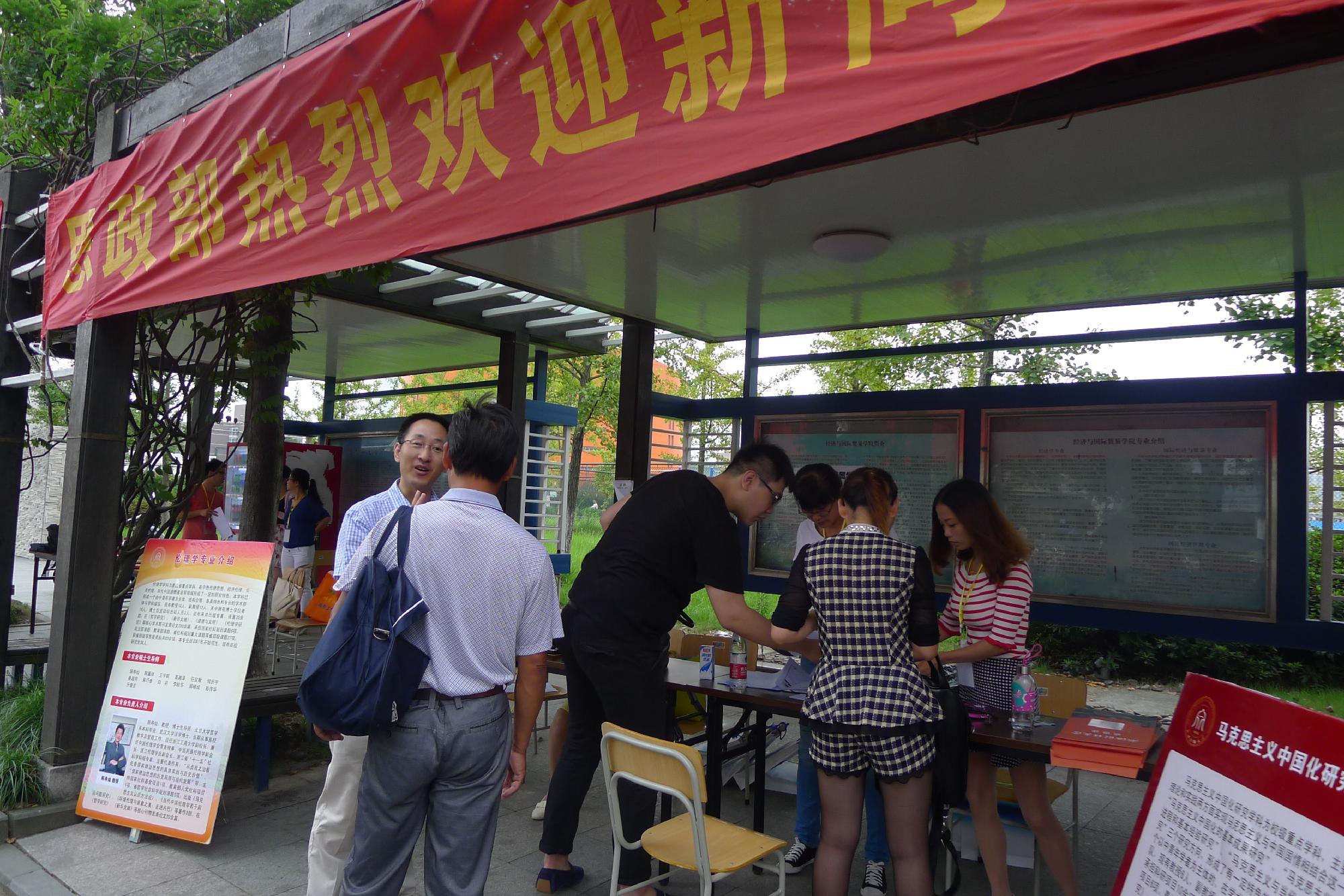 迎来了2014级560多位研究生新生。9月11日上午7:30,西大门文化长廊内,思政部研究生辅导员黄丽萍老师以及13级伦理学和中国化专业的学长们早早地等候在这里,开始了接待新生及家长的工作。