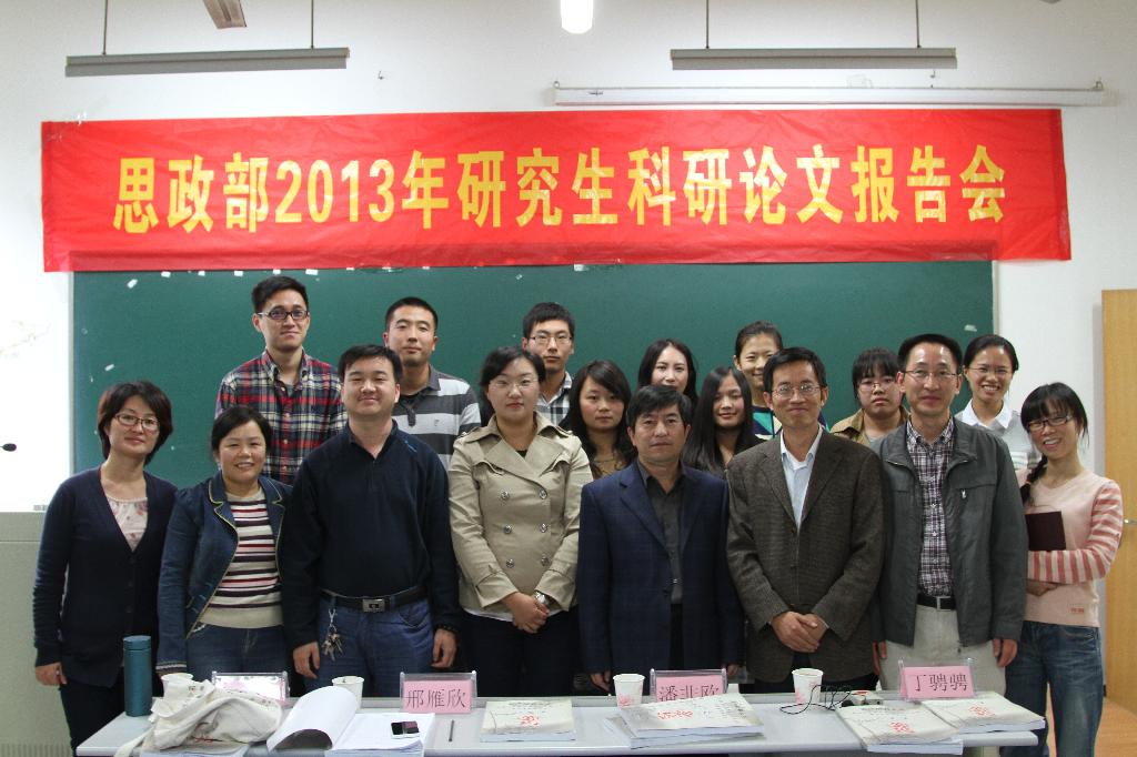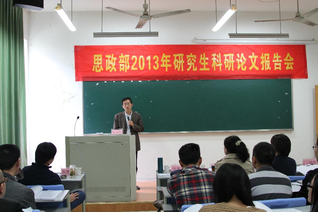 10月22日下午,3号教学楼209室座无虚席,热闹非凡。“思政部2013年研究生科研论文报告会”在此举行。思政部全体研究生齐聚一堂,思政部主任华正学教授、副主任何历宇教授、研究生处副处长丁骋骋及思政部相关评委老师,共同参与了此次学术会议。