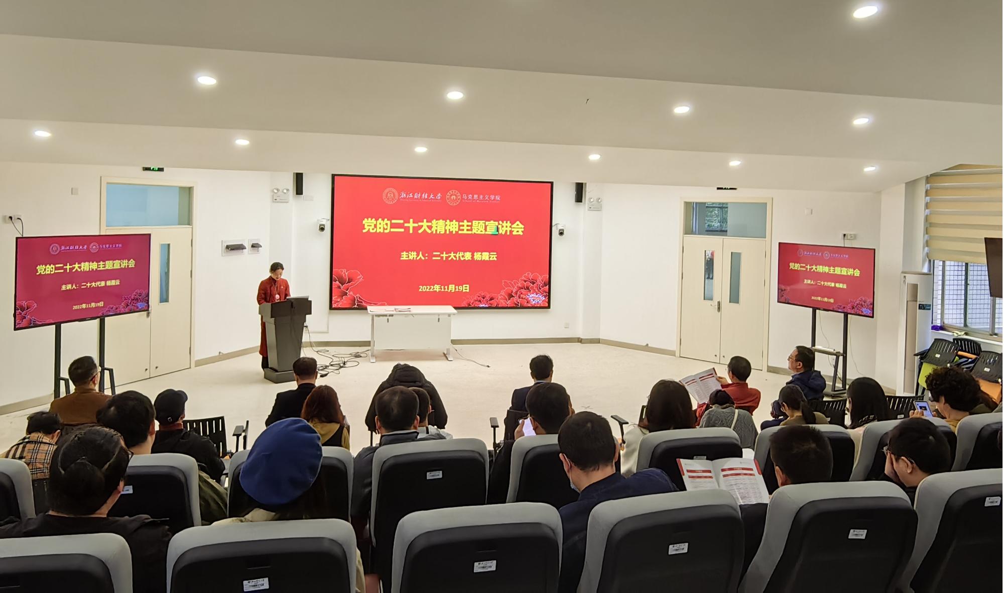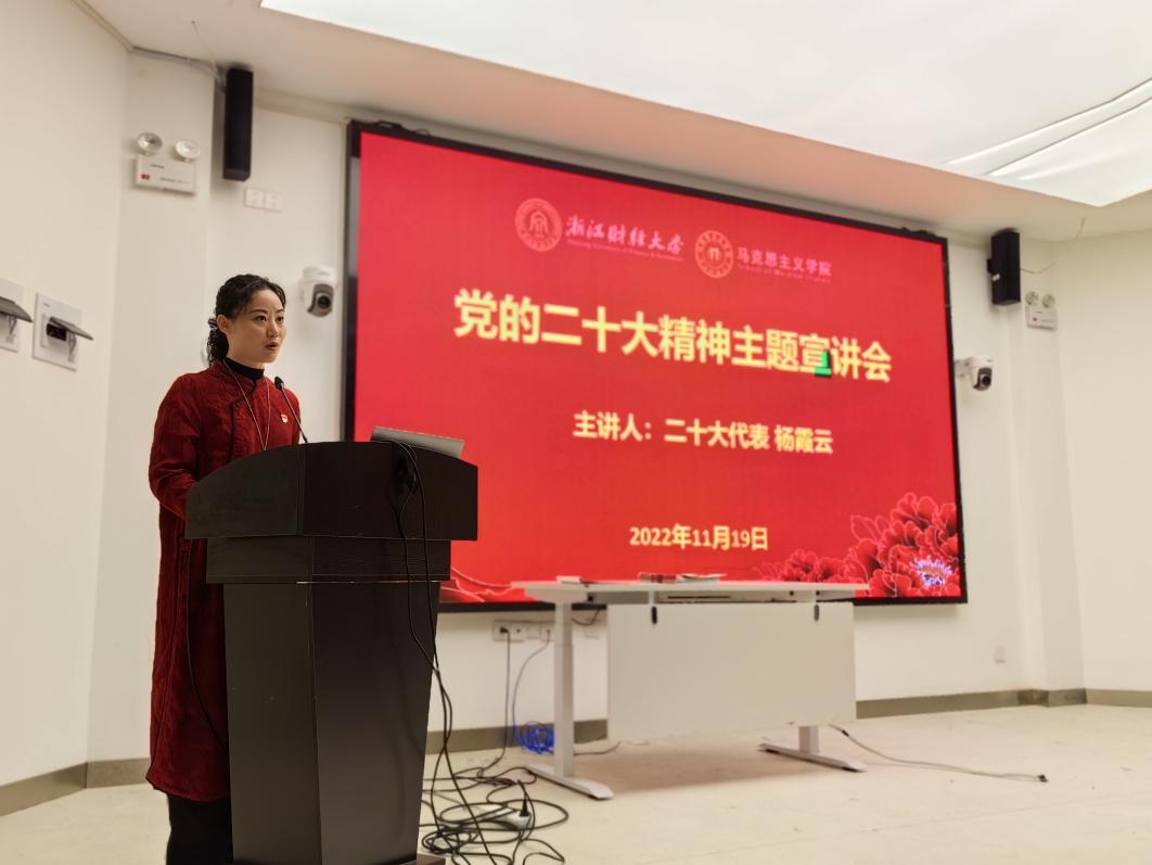 宣讲中,杨霞云以党的二十大亲历者的身份,以参会党代表的视角介绍了大会盛况和代表履职情况,分享了她在参会期间的所见、所闻、所学、所感,重点围绕二十大报告中“增强中华文明传播力影响力,坚守中华文化立场,讲好中国故事、传播好中国声音,展现可信、可爱、可敬的中国形象,推动中华文化更好走向世界”“马克思主义原理同中华优秀传统文化相结合”等内容进行了深入阐述。她强调,作为新时代青年文艺工作者,要深入学习贯彻党的二十大精神,将其转化为推动文艺事业进一步传承发展的动力,塑造出更多有筋骨、有道德、有温度的文艺形象,丰富百姓精神生活,增强人民精神力量。“我们要用戏曲讲好浙江故事、中国故事,不断提升中国文化软实力和中华文化影响力,为社会主义文化强国建设贡献力量。”