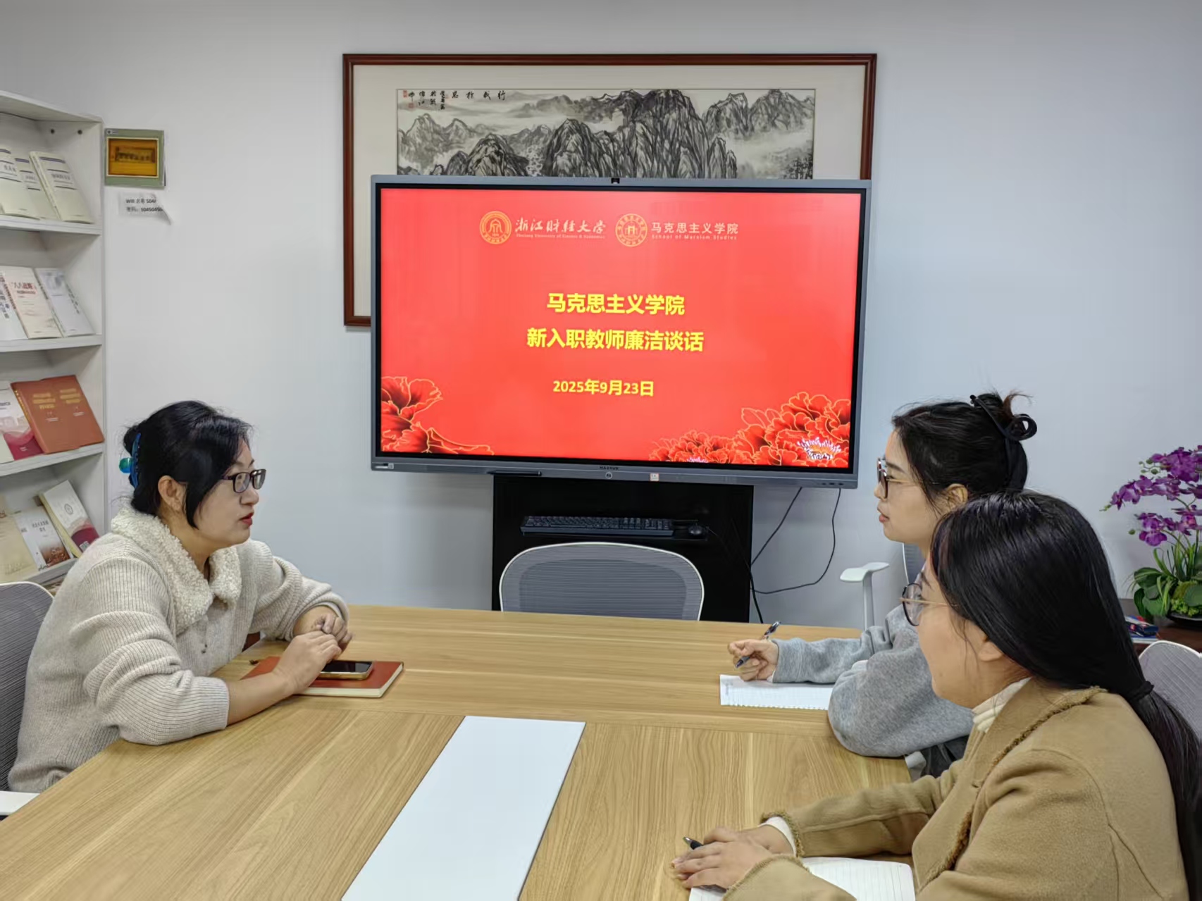 纪委组织新入职教师开展集体廉洁谈话。会议由纪委书记邢雁欣主持,新入职教师郑珺、任梦楠、程昊参加座谈。