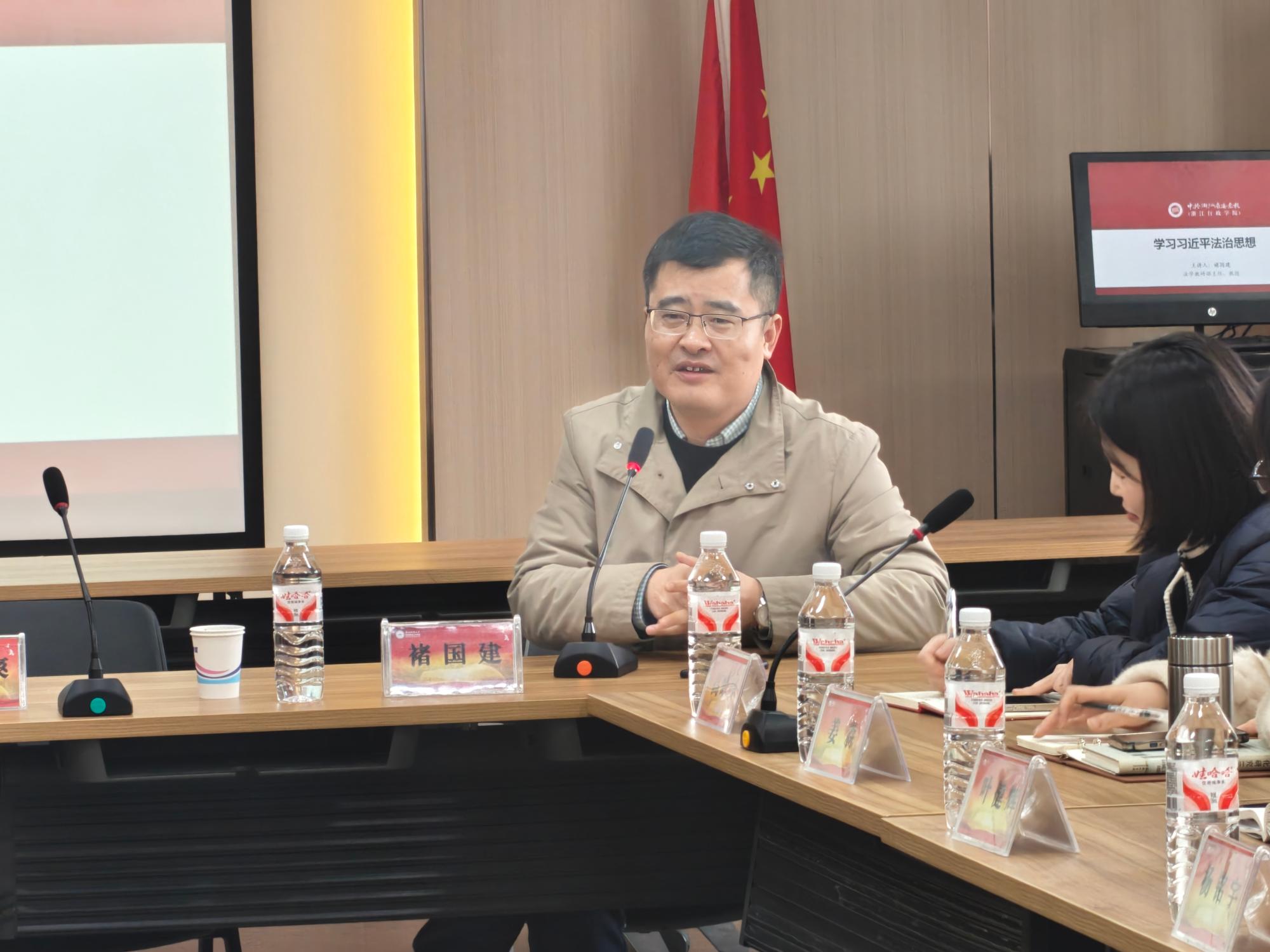 特邀浙江省委党校法学教研部主任褚国建教授开展“习近平法治思想”专题集体备课会。本次备课会由副院长邢雁欣主持,“习近平新时代中国特色社会主义思想概论”“思想道德与法治”“形势与政策”课程组教师及相关专业研究生共同参与,现场研讨氛围浓厚,成果丰硕。