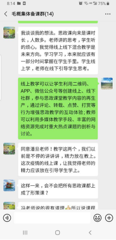思想政治理论课教师座谈会上的重要讲话和习近平总书记在全国高校思想政治工作会议上的讲话精神,不断推进思想政治理论课与信息技术高度融合,结合疫情期间线上课程的创新实践,毛概教研室本学期的教研活动聚焦于“融媒体,新思政”立体式教育模式。由于疫情防控要求,第11周,毛概教研室老师采取云会议形式,围绕着如何构建网络思政课程体系开展了热烈讨论。