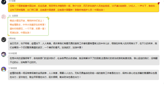 “抗疫,我们有中国制度”、“战疫时期的青年责任与担当”、“自然、疫情与我”、“重大疫情与敬畏生命”、“致敬医护人员”等等,这些都是马院老师在直播结束后和学生讨论的主题,而每一个问题之下都有数百条甚至上千条学生的热烈回应。韩金起老师班上18经贸1班的王烨同学追问“此次疫情防控过程中,哪些做法在中国可以做到,其他国家不可以,我们的优势有哪些?”来自肖云龙老师班上的寇雅洁同学从爱国主义、中国共产党领导和中国特色社会主义制度的显著优势和“四个自信”的角度分别谈了自己的看法;冯庆旭老师班上的郑烨波同学认为:“在重大疫情面前,生命可以脆弱的只是一个个冰冷的数字,同时生命也是顽强的,顽强到可以奋不顾身的奔赴战场。此次疫情让我们看到了青年的力量,也让我感受到了自我担当意识,危险当前,总是有人要付出,别人可为,我为何不可为呢?”